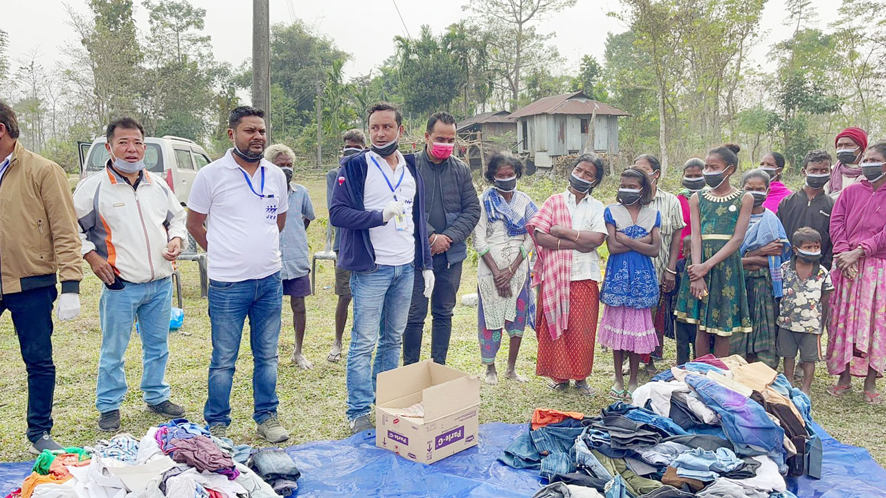 Jaigaon based NGO, Jaigaon Koshish Foundation voluntarily distributed clothes at Dal Badal Basti under Chuhapara GP and Godam Line of Kalchini TG. JKF had been collecting clothes from volunteer donors since last month. On the occasion of Makar-Shakranti and considering the present economic conditions of Tea Gardens; President Md Arif, Secretary Mintu Prasad along with members of Jaigaon Koshish Foundation distributed clothes & masks to the needy residing in the remote areas under Kalchini Block.